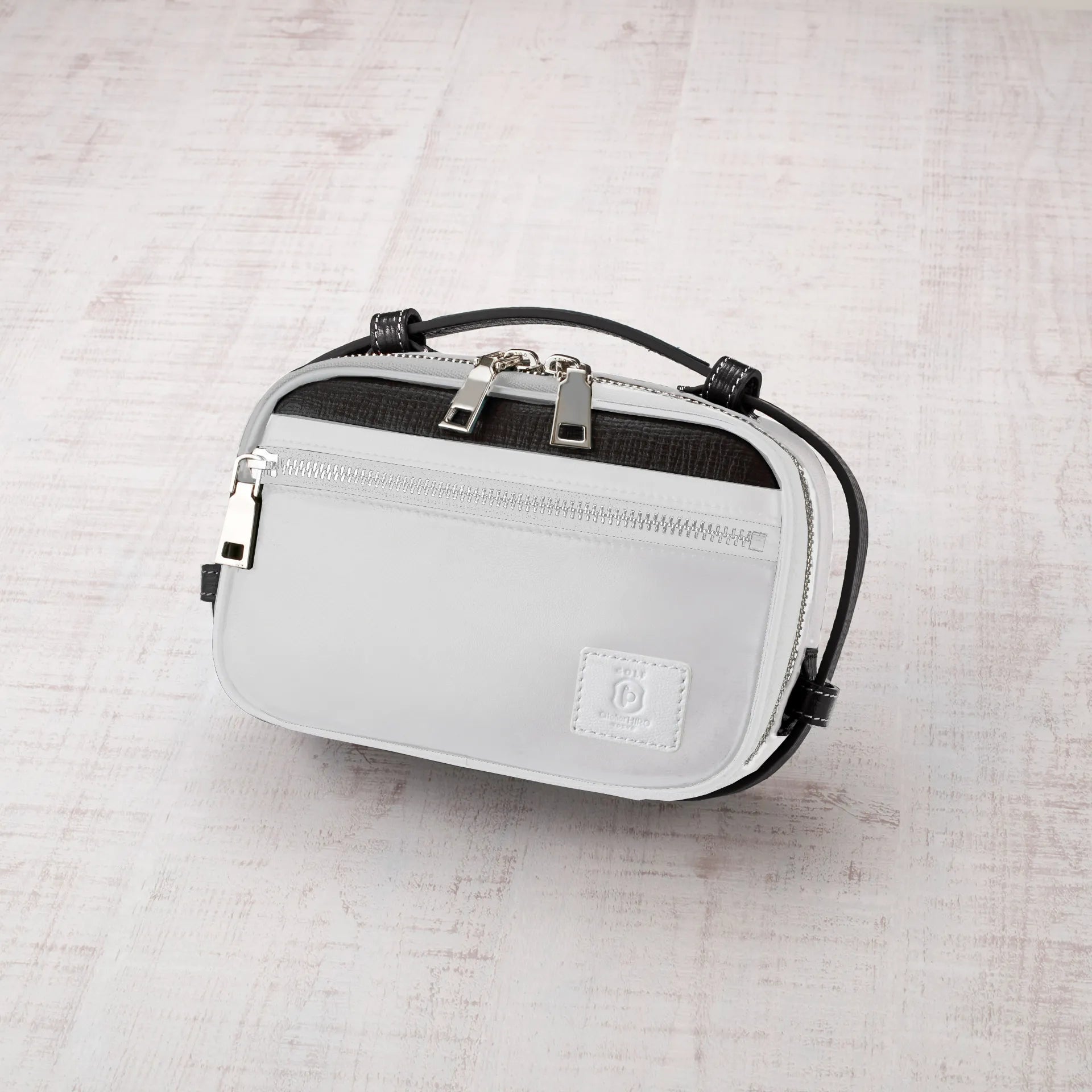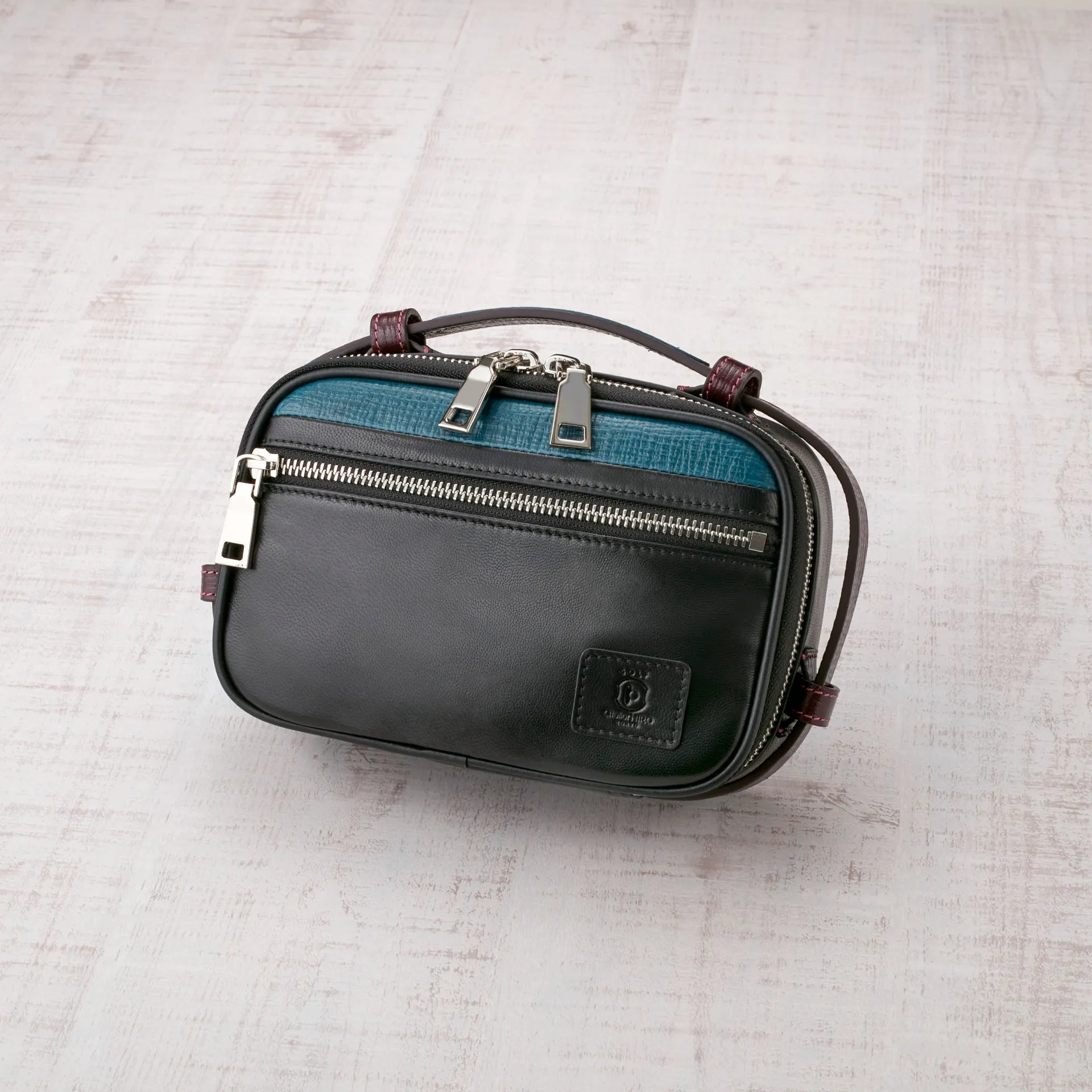 羊革を使用することでベースカラーを落ち着きのある柔らかい印象にしました。お洒落で美しい発色が特徴のPuccini社の革をハンドルとポケットの一部にあしらい、ベースカラー・アクセントカラー・エンボスカラーの3色使いが、デザインに奥行きを与えています。